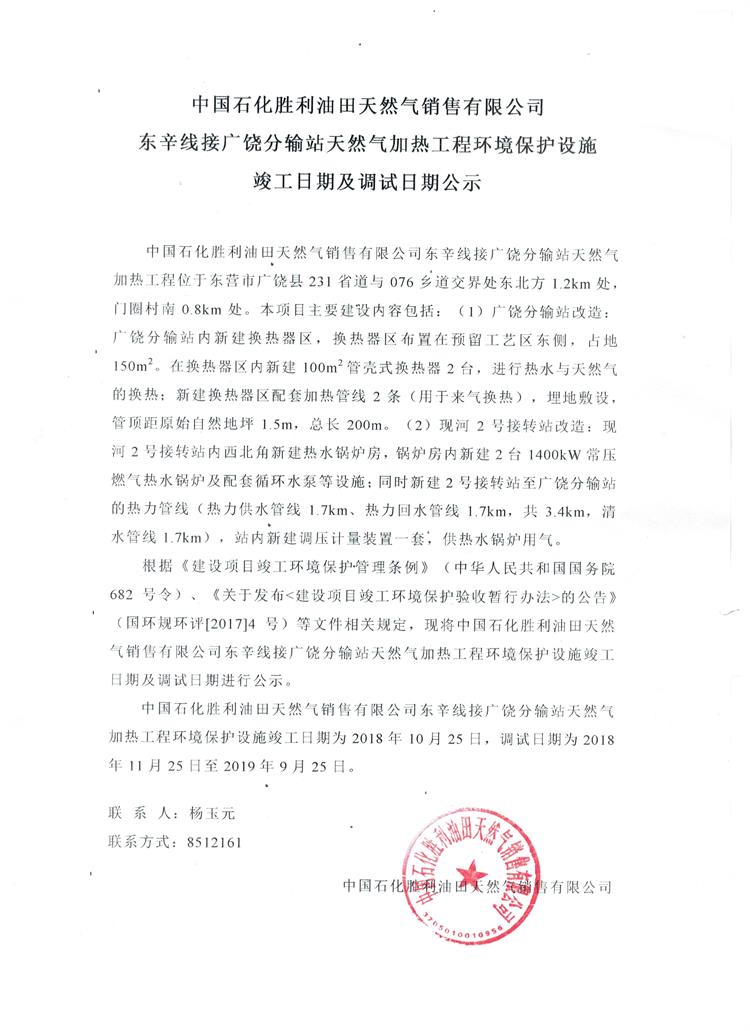 中國石化勝利油田天然氣銷售有限公司東辛線接廣饒分輸站天然氣加熱工程環境保護設施竣工日期及調試日期公示