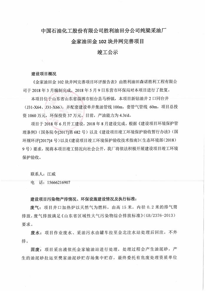 中國(guó)石油化工股份有限公司勝利油田分公司純梁采油廠金家油田金102塊井網(wǎng)完善項(xiàng)目竣工公示