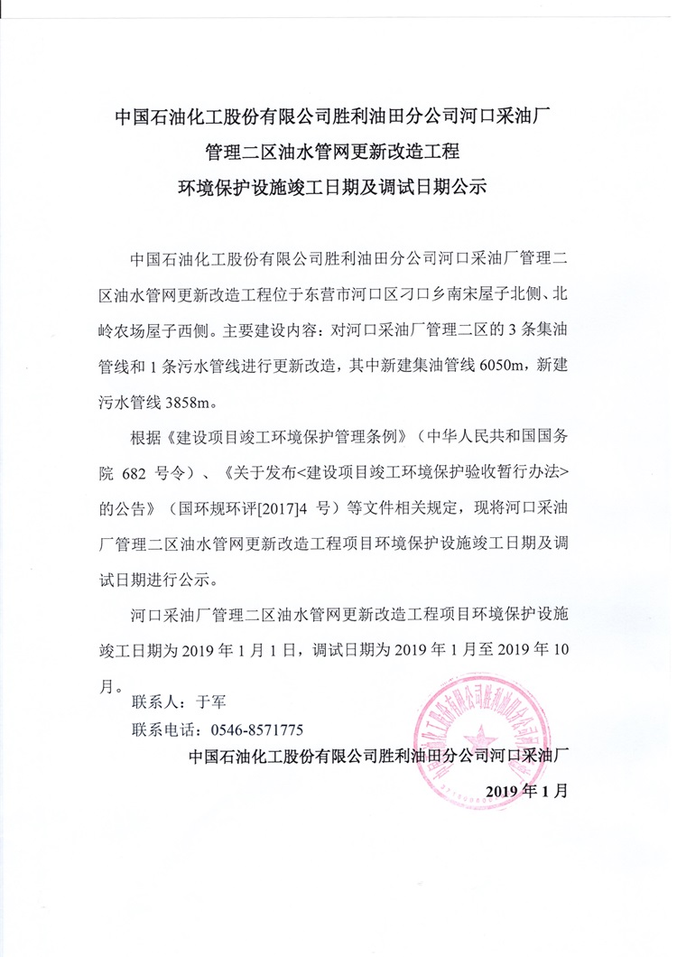 中國石油化工股份有限公司勝利油田分公司河口采油廠管理二區(qū)油水管網(wǎng)更新改造工程環(huán)境保護設(shè)施竣工日期及調(diào)試日期公示