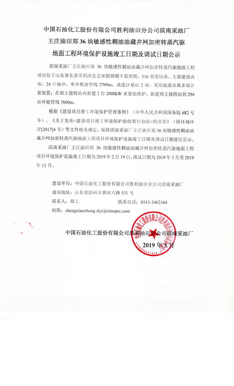 中國石油化工股份有限公司勝利油田分公司濱南采油廠王莊油田鄭36塊敏感性稠油油藏井網加密轉蒸汽驅地面工程環境保護設施竣工日期及調試日期公示
